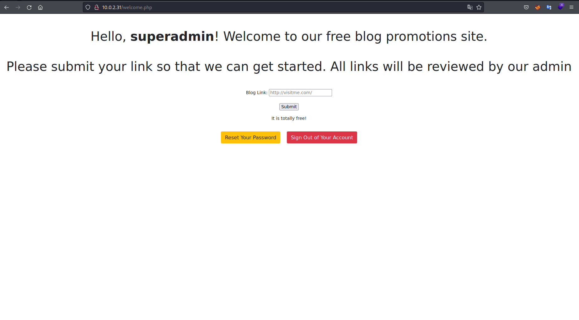 There was a login screen and an option to register. I tried some SQL injection attempts on the login page but could not get anywhere. So I registered an account and was taken to the following page.